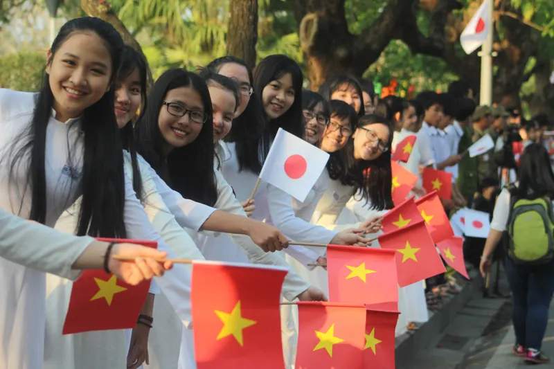 Trong lúc đợi Nhật hoàng và Hoàng hậu, em Nguyễn Phương Vy (học sinh trường THPT chuyên Quốc Học Huế) cho biết: "Em rất vui mừng vì mình được đứng đây chào mừng Nhật hoàng. Em đã đọc nhiều sách báo được biết Nhà vua và Hoàng hậu Nhật rất gần gũi với mọi người". Ảnh: NGUYỄN DO