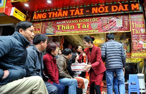 Còn tại Hà Nội, từ rất sớm đã có người đi mua vàng trên khu phố Trần Nhân Tông, tiệm vàng Bảo Tín Minh Châu. Lượng người xếp hàng vòng trong ra vòng ngoài. Bà Nguyễn Thúy Anh, đại diện Công ty Vàng bạc đá quý Bảo Tín Minh Châu, cho hay dịp thần tài năm nay, số lượng bán ra của thương hiệu vàng này tăng 300% so với cùng kỳ năm ngoái. Giá bán được công ty giữ ổn định, chênh lệch không lớn so với ngày thường.