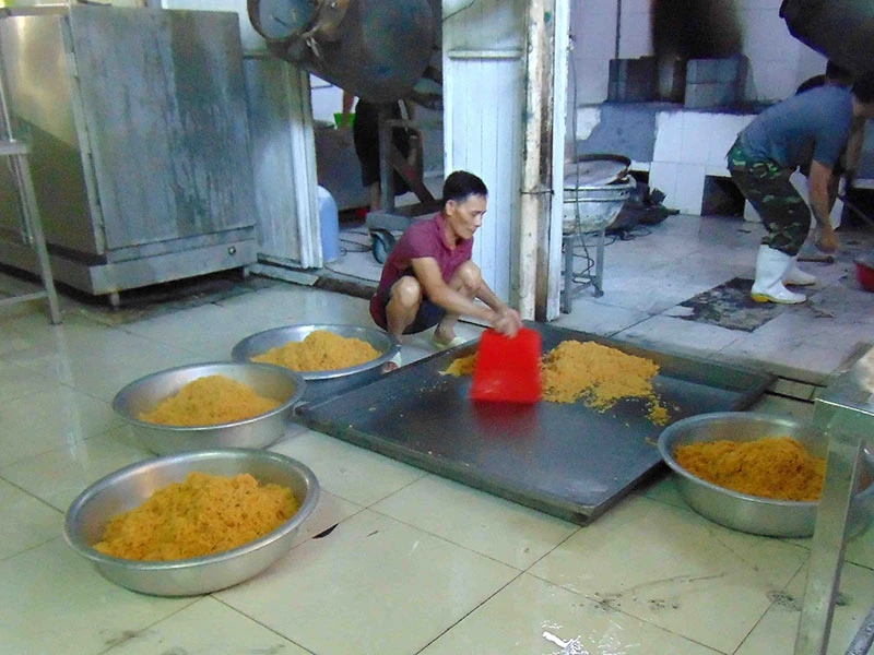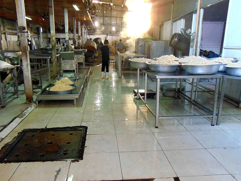 Tại thời điểm kiểm tra, đoàn ghi nhận khu vực sản xuất xuống cấp, nhiều công nhân không mặc đồ bảo hộ, không đeo khẩu trang, không mang găng tay khi tiếp xúc trực tiếp với thực phẩm. Ở công đoạn chế biến, chà bông để trên sàn nhà, nguyên liệu sản xuất không được che đậy theo quy định.