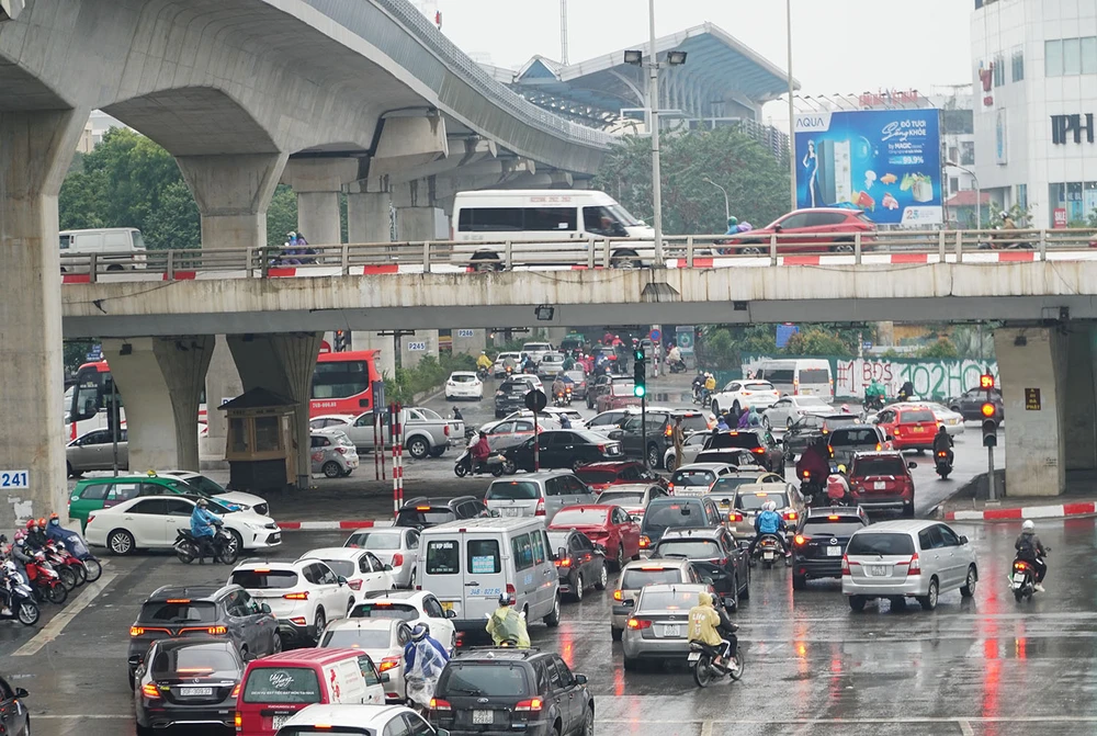Nút giao thông tại ngã tư cầu vượt Mai Dịch, dòng phương tiện có lúc ùn ứ.