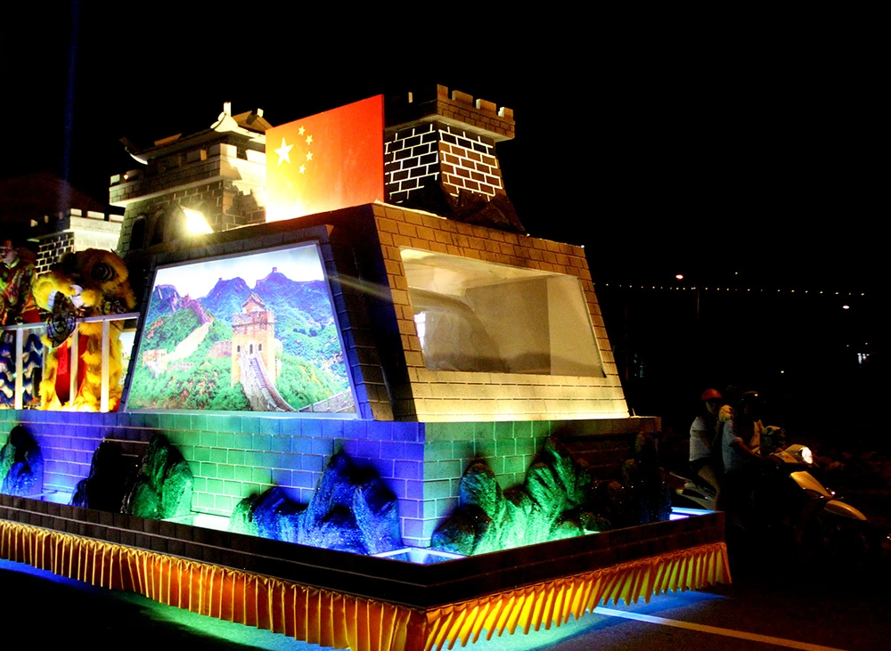 Xe của đội Trung Quốc là vạn lý trường thành được trang trí rực rỡ. Ảnh: N.TRI
