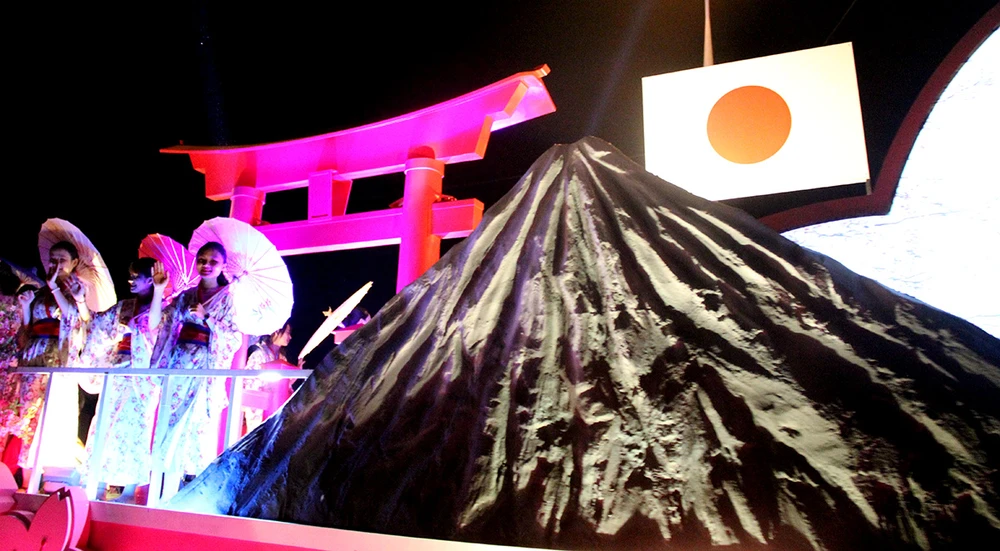 Xe hoa của các nghệ sĩ Nhật Bản mang hai biểu tượng của xứ sở mặt trời mọc là hoa anh đào và cổng Torii. Ảnh: N.TRI