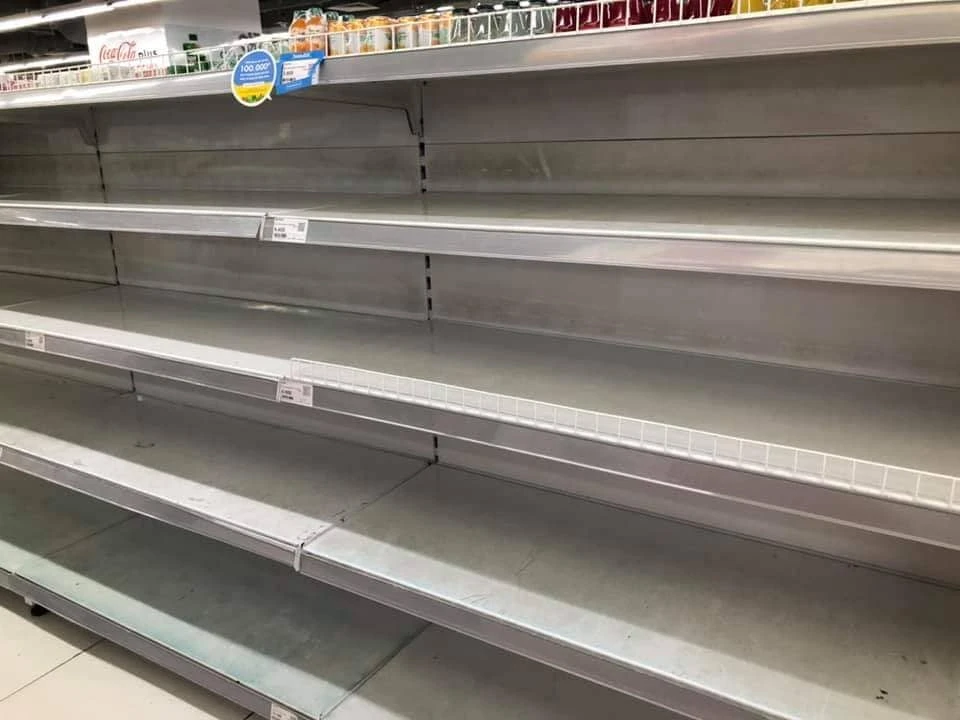 Kệ bán hàng nước đóng chai được người dân mua hết sạch. Ảnh: Facebook