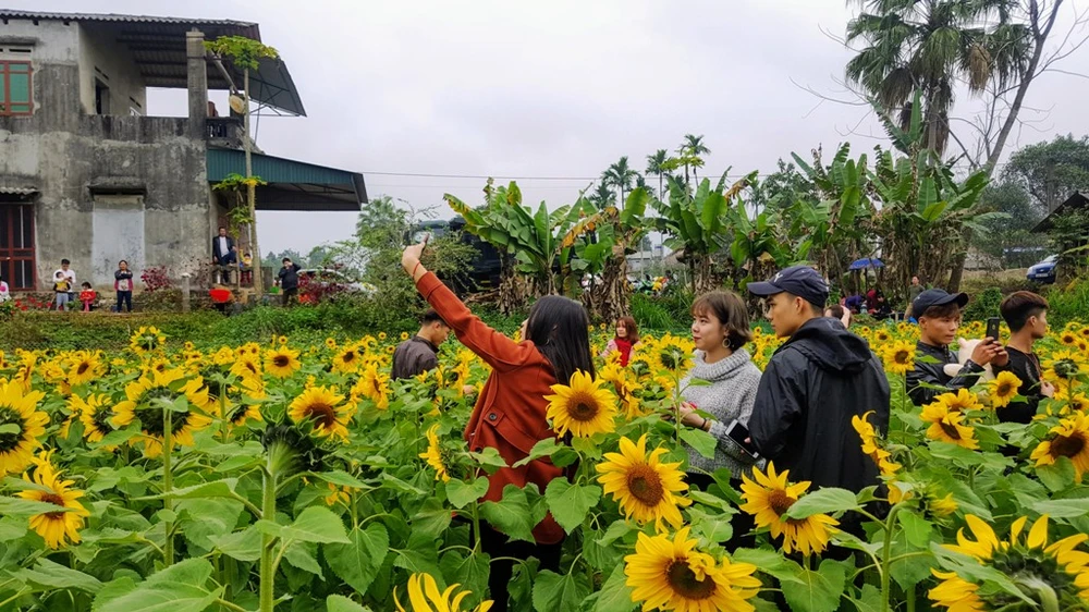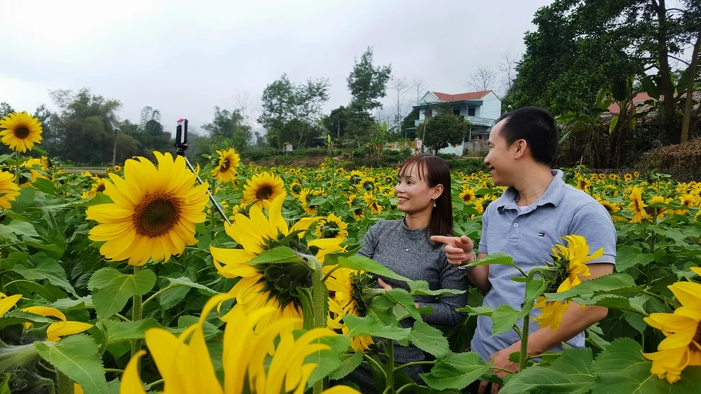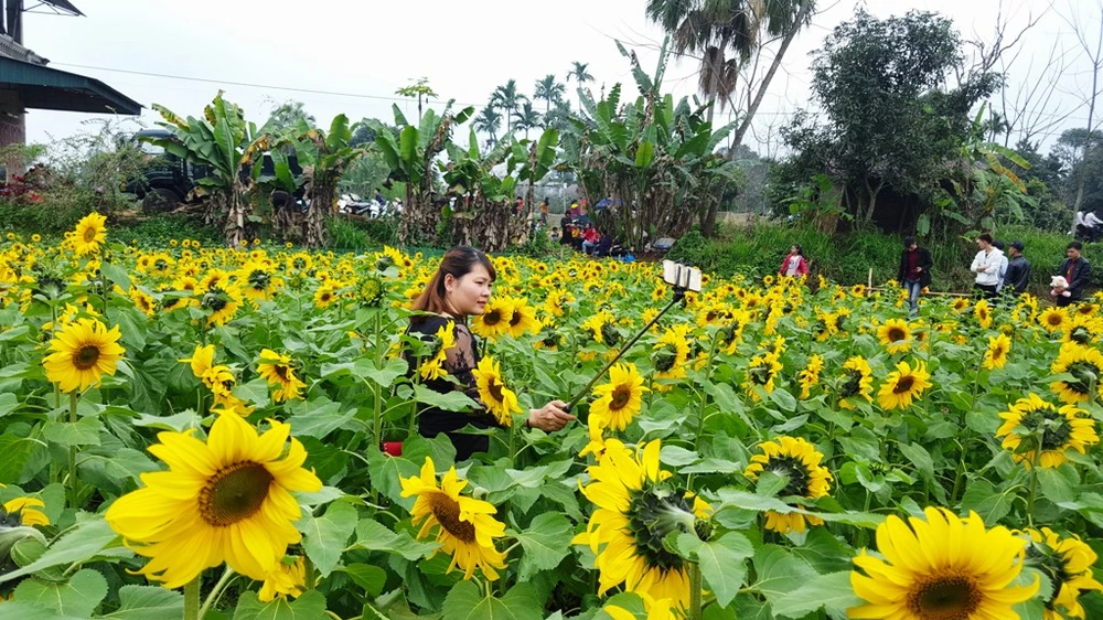 Vườn hoa hướng dương ở xã Động Đạt, huyện Phú Lương có quy mô hàng ngàn mét vuông. Đây là mô hình trồng hoa có diện tích lớn nhằm phục vụ nhu cầu du xuân và chụp ảnh cho du khách.