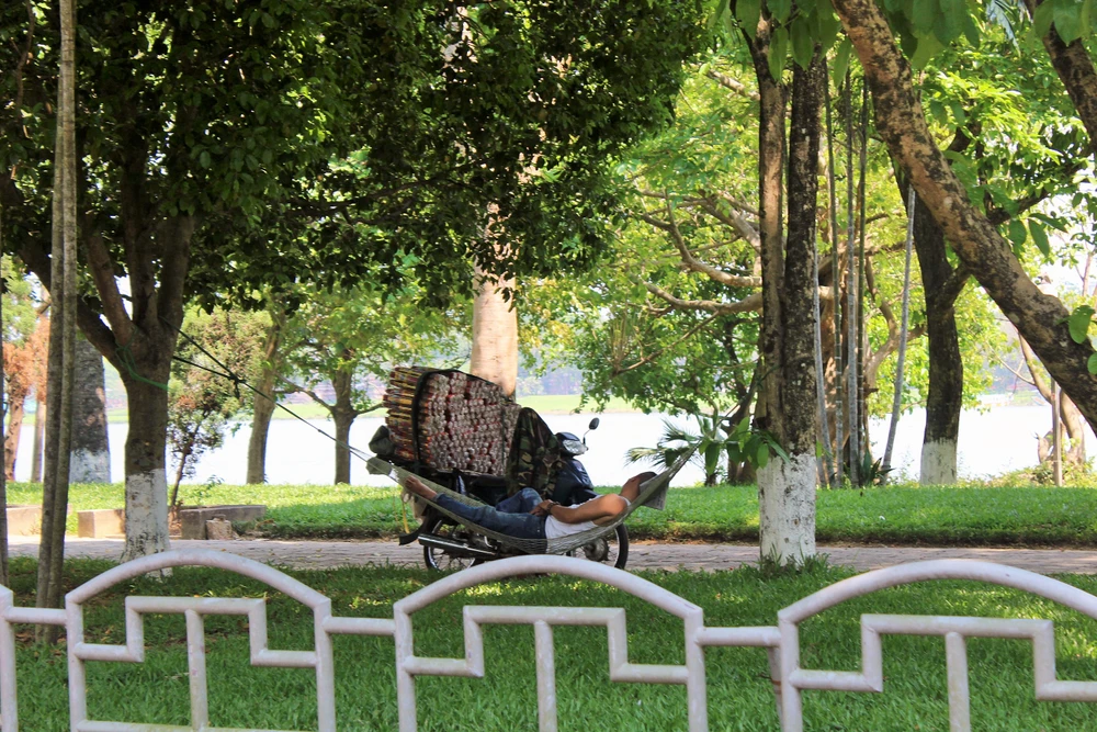 Những người bán hàng rong chọn bãi cỏ ven sông ngủ một giấc để tiếp tục bán hàng vào buổi chiều.