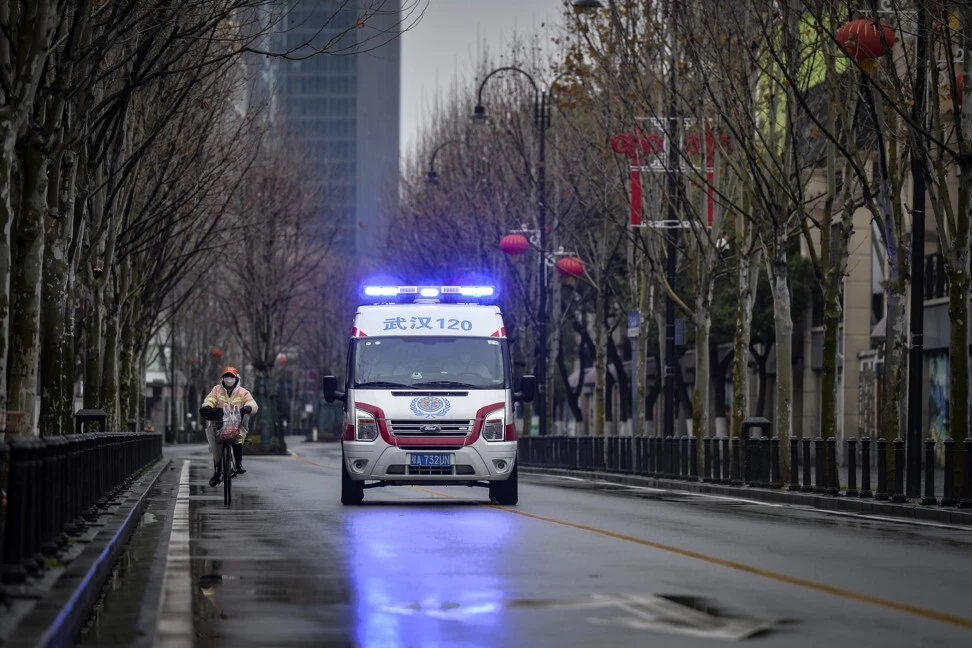 Xe cứu thương trên đường phố Vũ Hán vắng vẻ, ngày 28-2. Ảnh: GETTY IMAGES