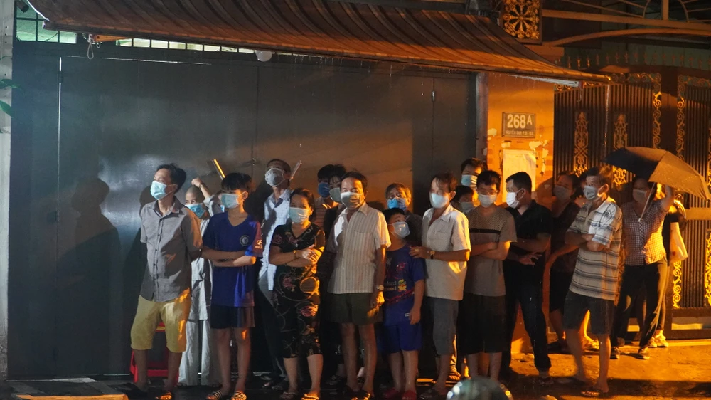 Khoảng 6h30 tối, trời bắt đầu đổ mưa, người dân đến xếp hàng lấy mẫu phải tranh thủ trú mưa hoặc đi về nhà tạm. Công tác lấy mẫu bị gián đoạn trong khoảng 20 phút. Ảnh: MINH TÂM