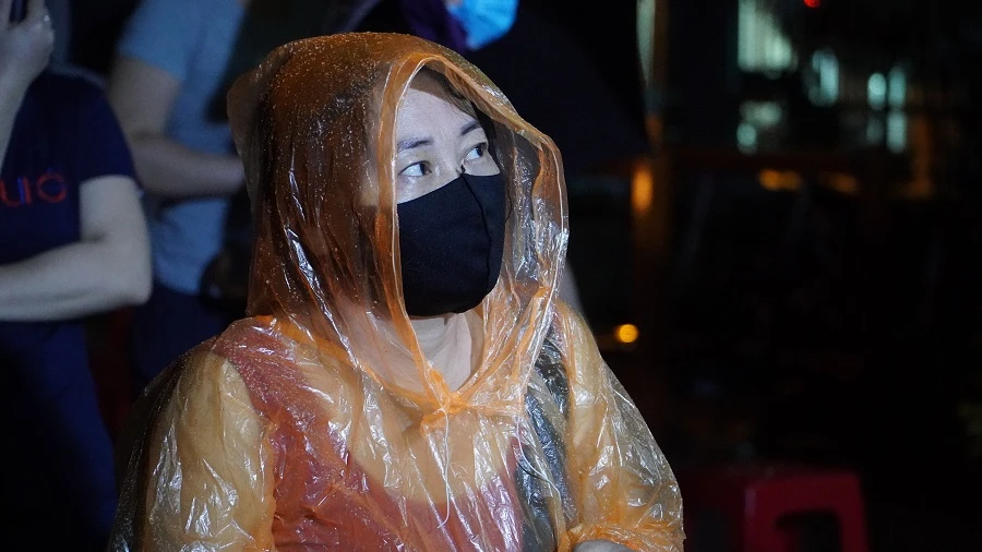 Chị Hồng Ngọc Kim Trang, ngụ tại phường 9, quận 8, TP.HCM cho hay: "Tôi buôn bán tại nhà tiếp xúc nhiều người nên cũng lo sợ lắm. Vừa nghe tin lấy mẫu xét nghiệm tội vội đi ngay. Ra tới nơi thì trời mưa nên mặc luôn áo mưa để đợi. Vì an toàn cho chính mình nên dù có mưa tội cũng ráng lấy mẫu cho xong." Ảnh: MINH TÂM