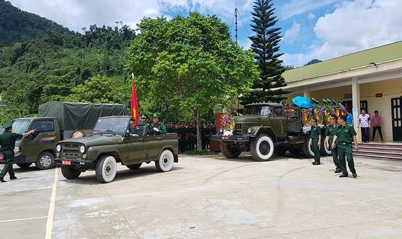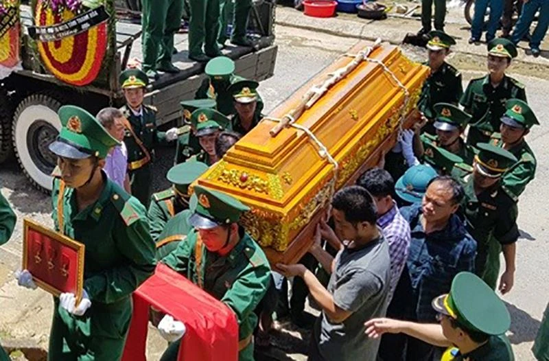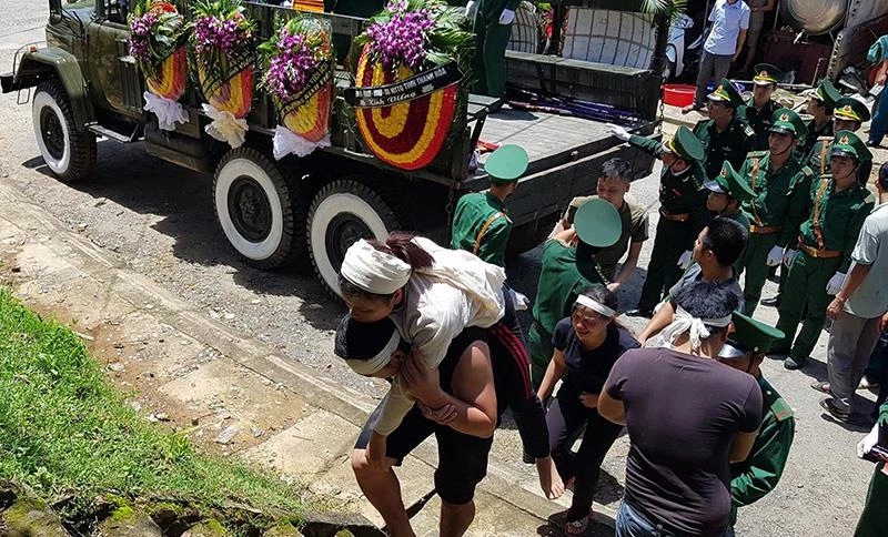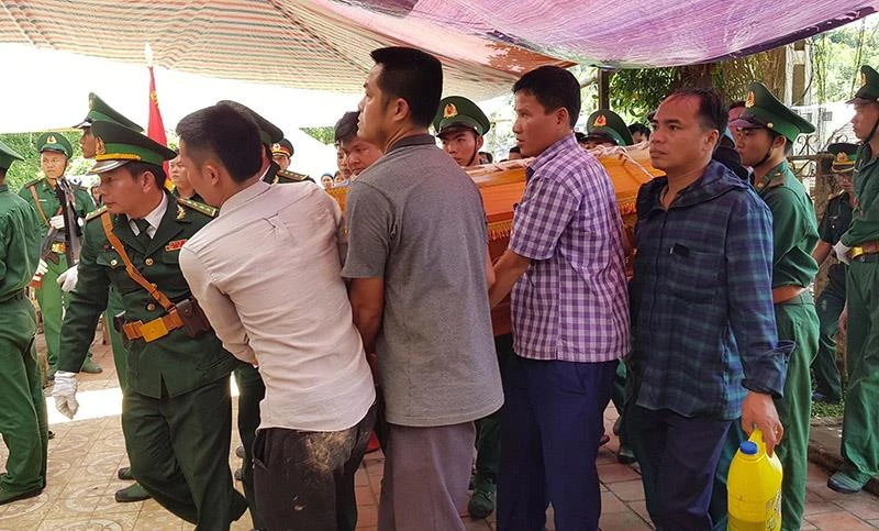 Người dân địa phương cùng với cán bộ chiến sĩ biên phòng đưa tiễn anh về nơi an nghỉ cuối cùng. Sự hy sinh của anh làm nhiều trái tim nghẹn lại vì đau xót.