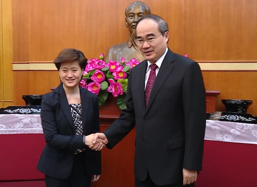 Chủ tịch Ủy ban Trung ương MTTQ Việt Nam Nguyễn Thiện Nhân (trái) tiếp Đại sứ Singpaore - bà Catherin Wong.