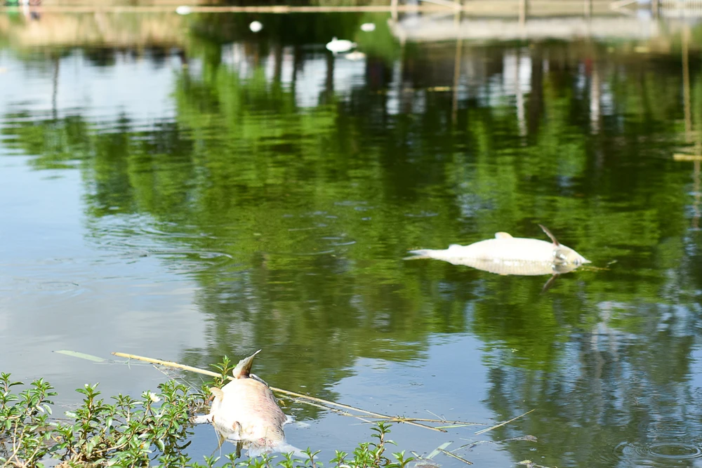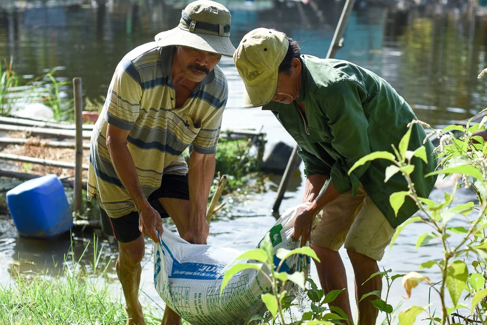 Người dân vớt những con cá trắm cỏ bị chết. Ảnh: NGUYỄN DO