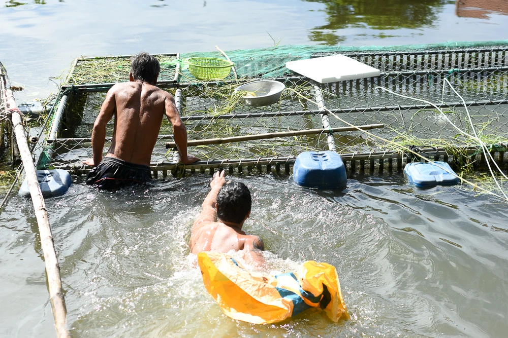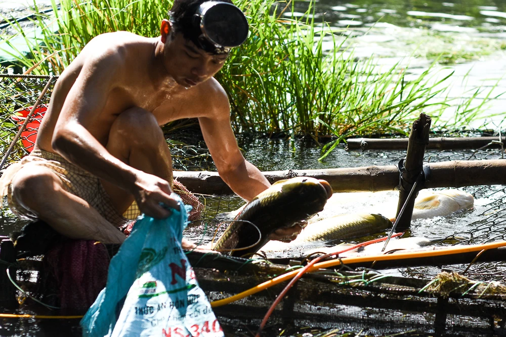 Sáng nay người dân rất khẩn trương để vớt những con cá còn có thể bán được. Ảnh: NGUYỄN DO