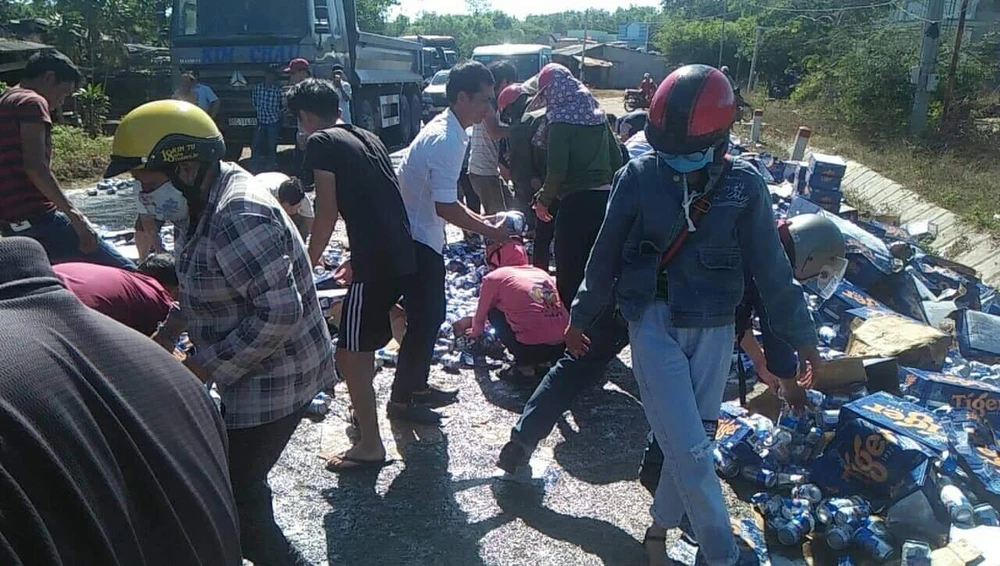 Khoảng 14g30 ngày 16-2, trên QL55 đoạn qua xã Thắng Hải, huyện Hàm Tân, tỉnh Bình Thuận, xe tải 51D-237.16 chở bia lưu thông theo hướng Bà Rịa-Vũng Tàu đi Bình Thuận đã bị bung thùng xe khiến hàng trăm thùng bia đổ xuống đường.