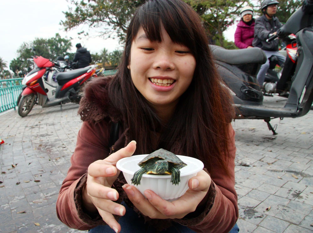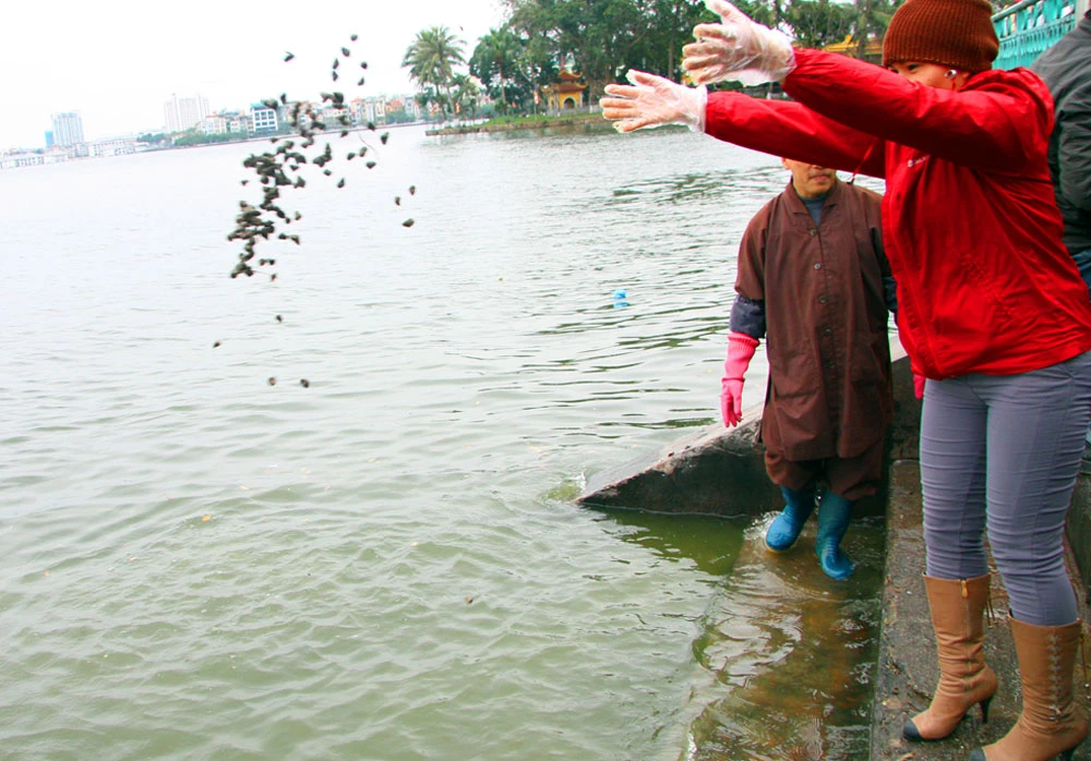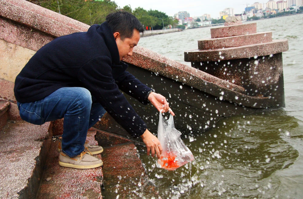 Theo ghi nhận quanh khu vực Hồ Tây (Hà Nội), các bạn sinh viên và sư thầy đều có mặt ở các điểm thả cá, tình nguyện nhặt rác, hướng dẫn người dân đến thả cá, giúp sông, hồ sạch sẽ, bảo vệ môi trường.