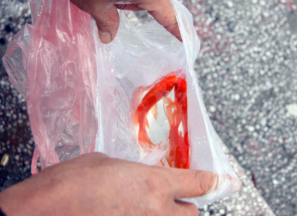 Sau đó thầy gom túi nylon, tránh tình trạng người dân vứt tràn ra vỉa hè. Các bạn tình nguyện treo biển “thả cá không thả túi nylon” để nâng cao ý thức người dân khi thả cá.
