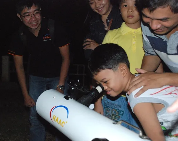 Các bạn trẻ thay phiên nhau lần lượt nhìn vào kính thiên văn xem “mặt trăng máu”.