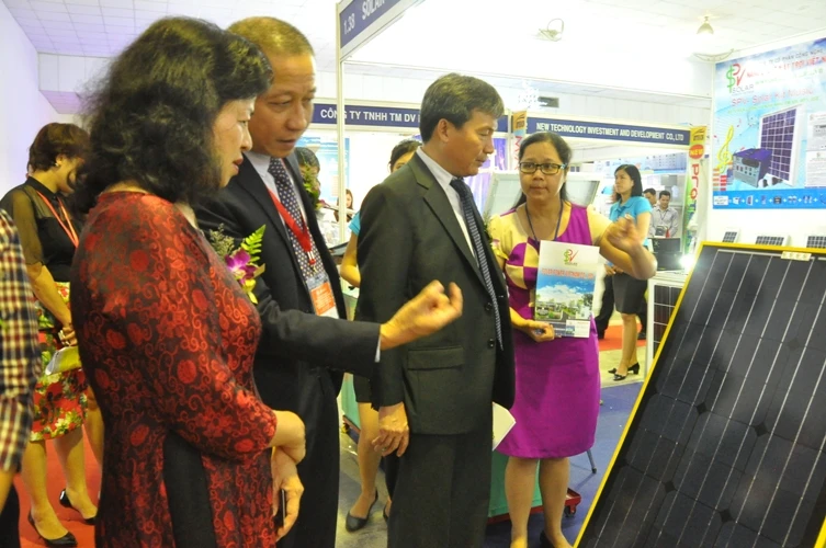 Đại diện Bộ Công Thương, UBND TP tham quan gian hàng thiết bị năng lượng mặt trời. Ảnh: Q.Như