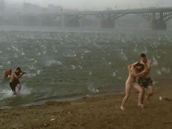 Trận mưa đá bất ngờ khiến những người có mặt trên bãi biển chạy tán loạn để tìm nơi trú ẩn.