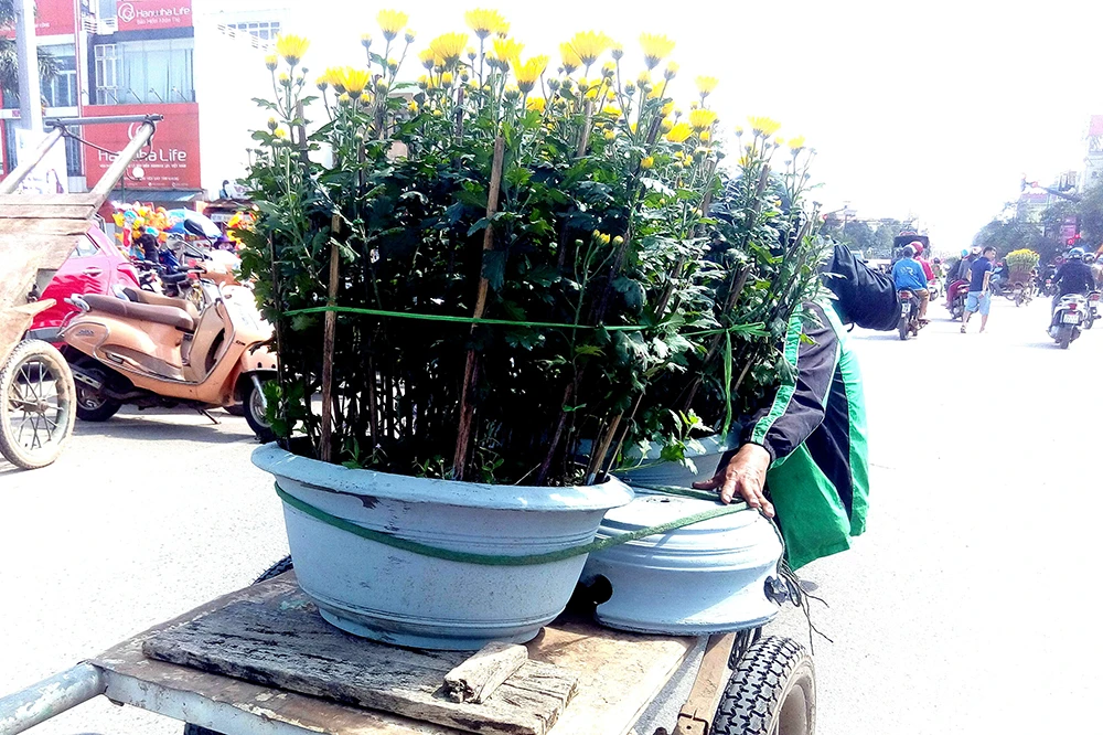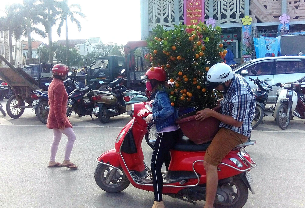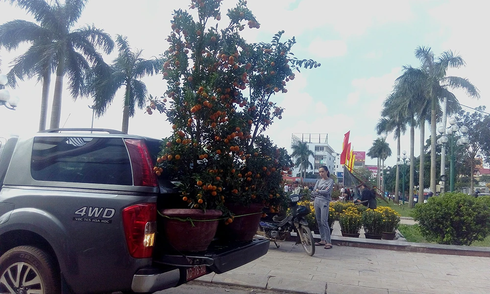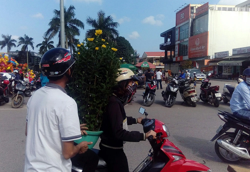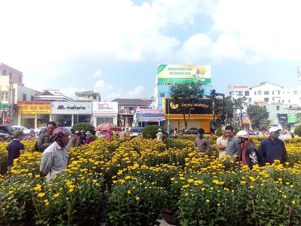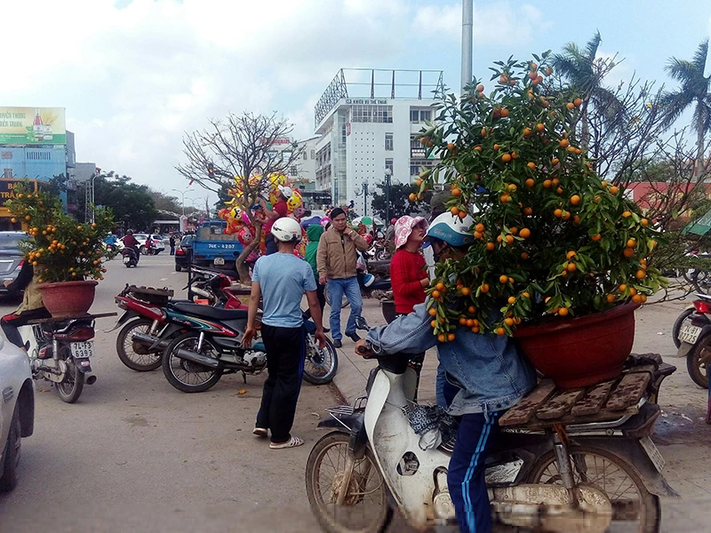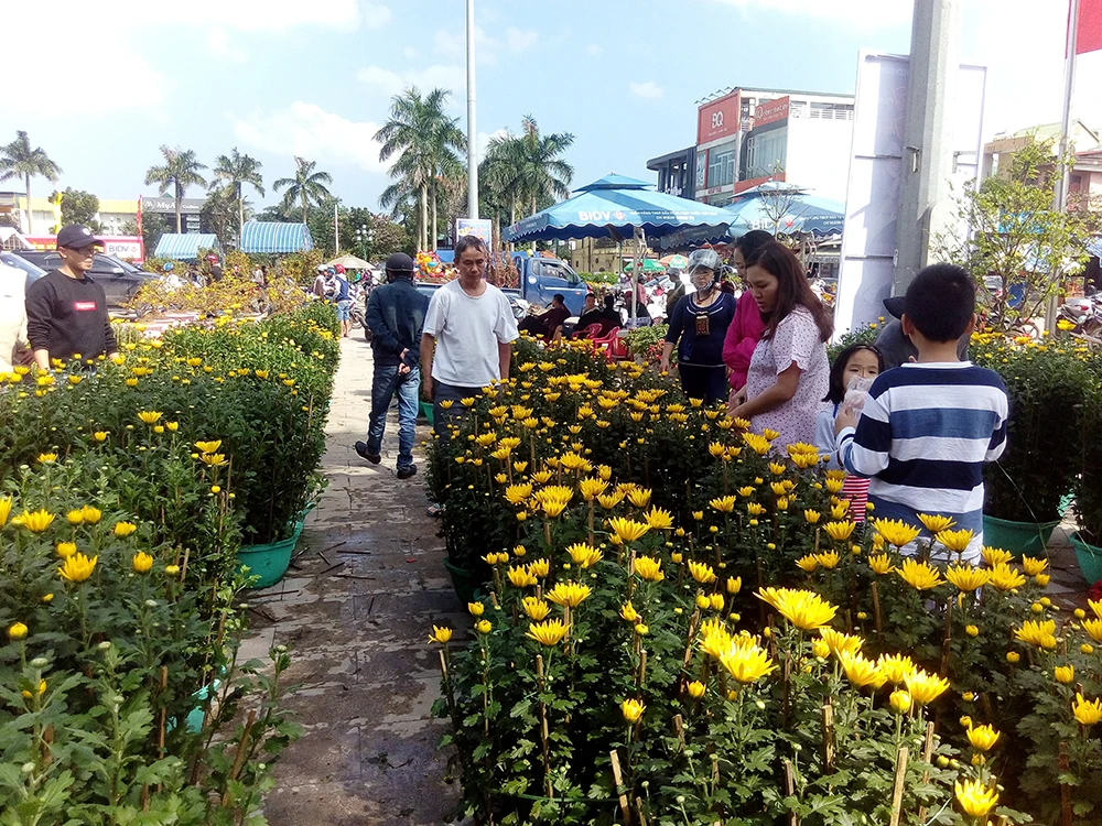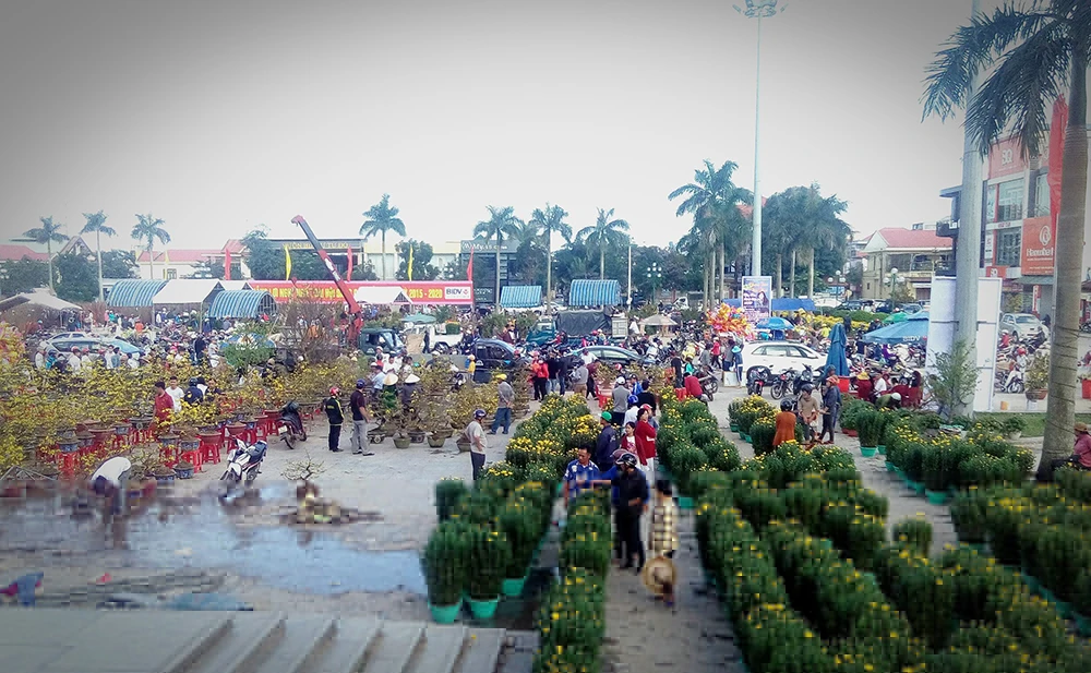 Tại chợ hoa trên đường Hùng Vương, thành phố Đông Hà (Quảng Trị) vào trưa ngày 27-1 (30 tết), người dân hối hả chọn mua những chậu hoa tươi thắm, trên các tuyến đường nhộn nhịp những chuyến xe chở các chậu hoa mai, quất, cúc.. . không khí năm mới tràn ngập.
