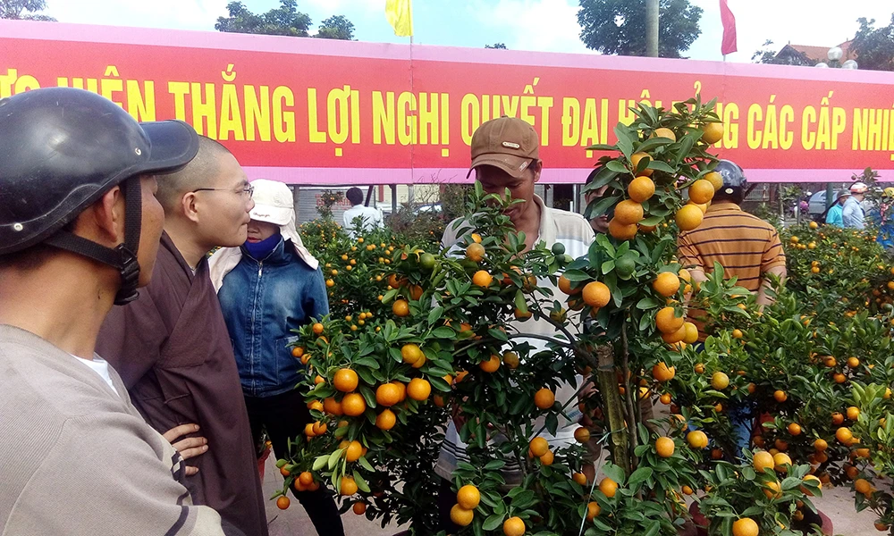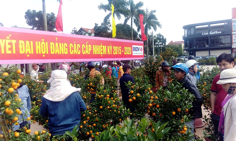 Tại gian hàng bày bán cây quất được nhiều người đến chọn mua.