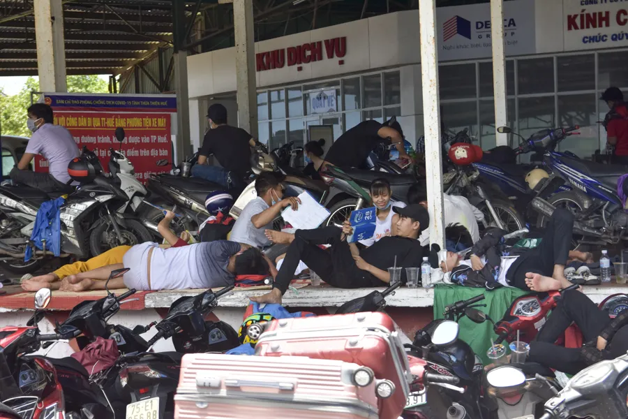 Ở chốt kiểm tra y tế số 5 - nơi kiểm soát người về bằng xe máy thì vẻ mệt mỏi của người dân càng lộ rõ hơn vì họ phải di chuyển liên tục bằng xe máy từ TP.HCM về Huế. Họ nằm la liệt ở trên mặt sàn - nơi đặt chốt kiểm dịch và chưa biết đến lúc nào có thể được đưa đi cách ly tập trung.