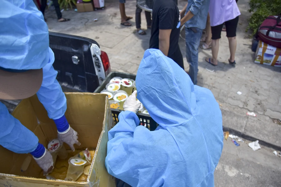 Lực lượng chức năng và người dân liên tục hỗ trợ thức ăn, nước uống cho những người đang đợi ở chốt kiểm tra y tế. Ảnh: NGUYỄN DO