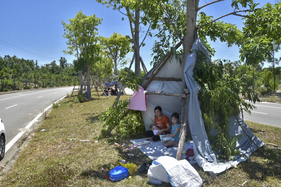 Dưới cái nắng nóng ở Thừa Thiên – Huế, nhiều người dân đã lấy những tấm màn, bạt,... che chắn để người thân ngồi nghỉ chân ở bên lề đường. Nhiều gia đình có con nhỏ và tất cả mọi người đều có vẻ rất mệt mỏi.