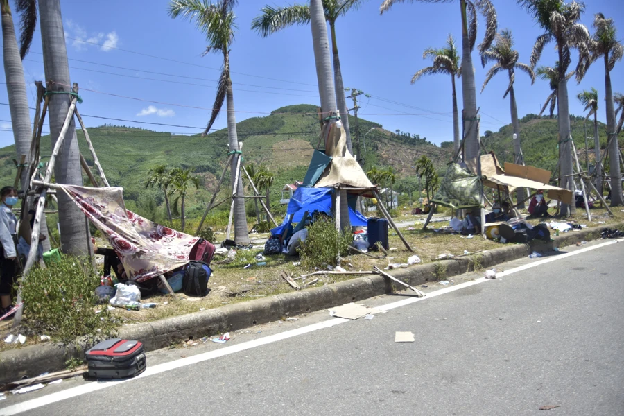 Người dân nằm la liệt ở sàn của trạm trung chuyển xe máy và người qua đèo Hải Vân, nay được sử dụng làm chốt kiểm dịch Y tế. Ảnh: NGUYỄN DO