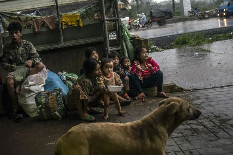 Bên trong căn lều tạm bợ, người già và trẻ em đang túm tụm nhau với đôi dép và quần áo lấm lem đất bùn, ăn cơm từ các bát nhựa. Một người thì ngồi trên tấm vải nhựa sọc xanh cam trải trên sàn bê tông, trong khi một số nhìn chằm chằm với ánh mắt vô hồn.