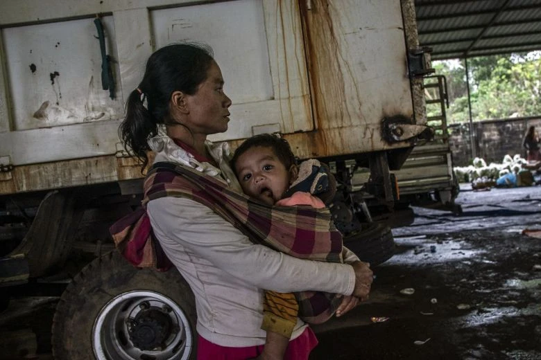 Một người mẹ ôm đứa con khi đang chờ thức ăn trong trại trú ẩn tạm thời ở Paksong. Ảnh: NY TIMES