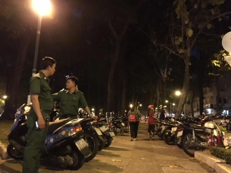 Một góc nhỏ công viên gần Hội trường Thống Nhất được dùng để trông xe cho người dân tới viếng. Đến tối muộn, vẫn còn hàng trăm chiếc xe máy.