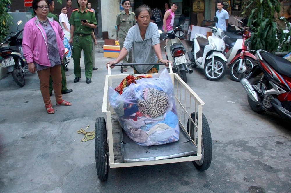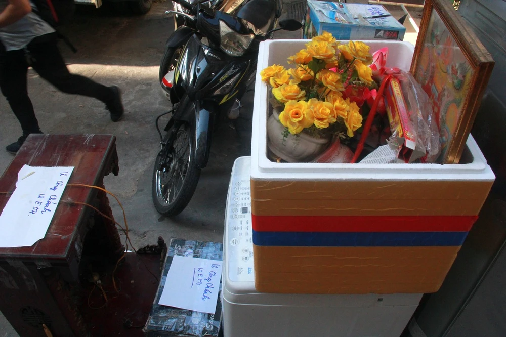 Các vật dụng trên bàn thờ tổ tiên được gom lại để đưa tới nơi ở mới. Hiện đã có 36/38 hộ dân đã đồng ý dọn đồ di dời tới nơi ở mới, vẫn còn 2 hộ đi vắng nên chính quyền đang liên hệ để di dời. "Trước mắt, quận sẽ hỗ sợ mỗi hộ dân 50 kg gạo, UBND quận và phường sẽ nghiên cứu thêm để có chi phí hỗ trợ bà con trong dịp Tết sắp tới, riêng phí vận chuyển đồ đạc và nơi ở mới sẽ được miễn phí hoàn hoàn. Trước mắt phải lo nơi ở mới cho bà con được an toàn trước, các vấn đề liên quan sẽ bàn sau" - bà Chi cho biết thêm.