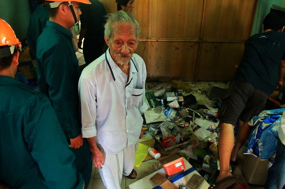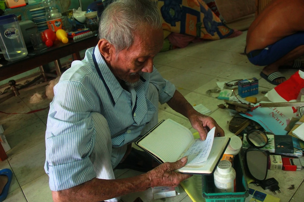 Ông Lê Công Chánh (90 tuổi), đang xem lại các giấy tờ, đồ dùng cũ trước đây để chuyển đi không bị sót.