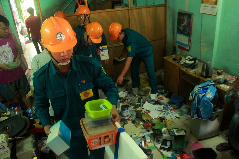 Lực lượng chức năng phối hợp cùng chính quyền phường Cầu Kho hỗ trợ 38 hộ dân tại lô E, chung cư 518 Võ Văn Kiệt di dời tới nơi an toàn.