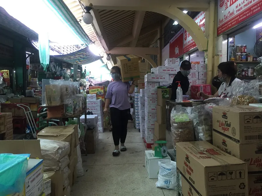 Ghi nhận tại chợ sỉ Bình Tây (quận 6) phần lớn các ngành hàng gia vị, thực phẩm chế biến... tiểu thương vẫn kinh doanh bình thường, chỉ có các sạp bán vải, thời trang là tạm đóng cửa.