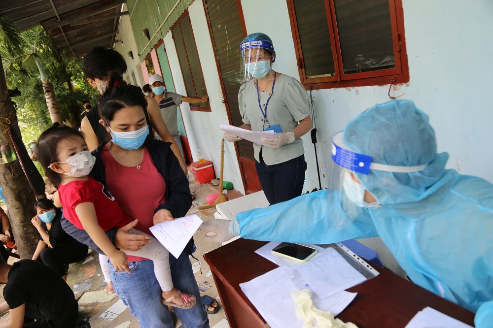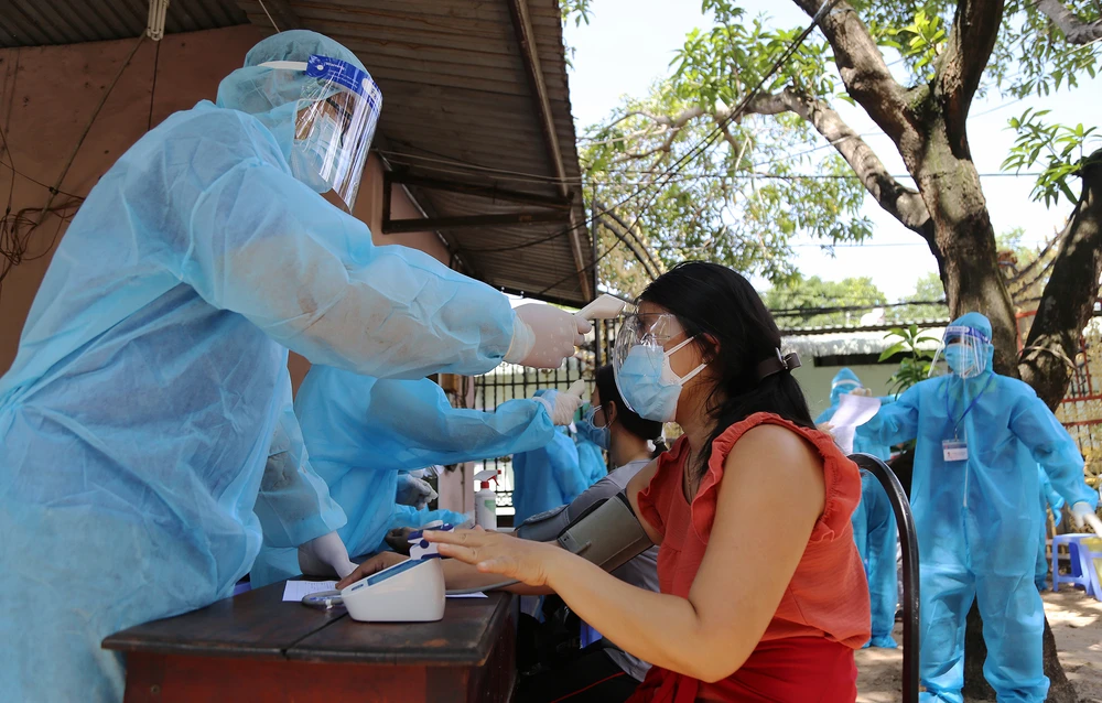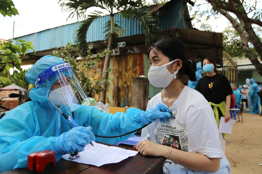 Sau khi có kết quả test nhanh âm tính với COVID-19, người dân được khám sàng lọc trước khi tiêm vaccine.