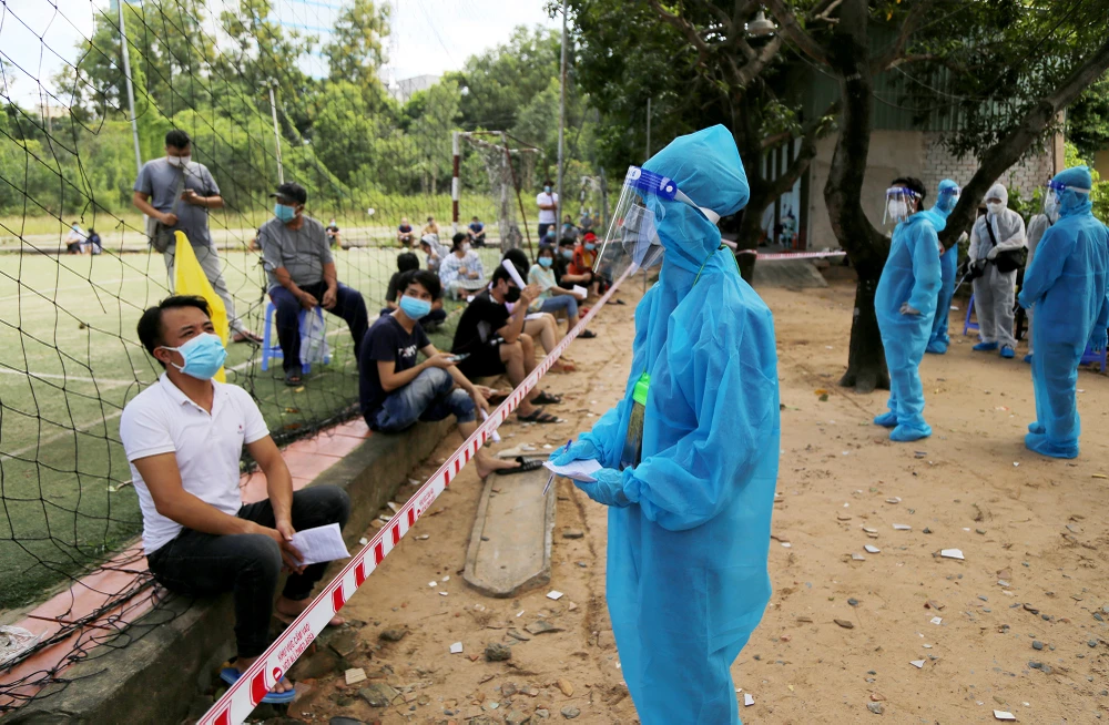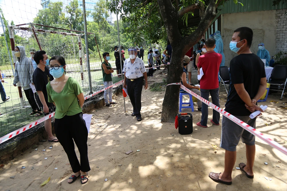 Người dân khu phong tỏa ở khu phố 6, phường Linh Trung, TP Thủ Đức xếp hàng trong khuôn viên một sân bóng đá trên địa bàn phường để chờ tiêm vaccine.