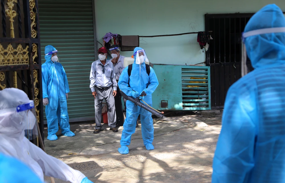 Nhân viên y tế phun khử khuẩn điểm tiêm do có trường hợp test nhanh nghi ngờ nhiễm COVID-19.