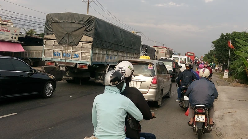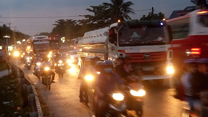 Đoạn đường qua huyện Cái Bè, tỉnh Tiền Giang xe đông vào buổi chiều nhưng không xảy ra ùn ứ.