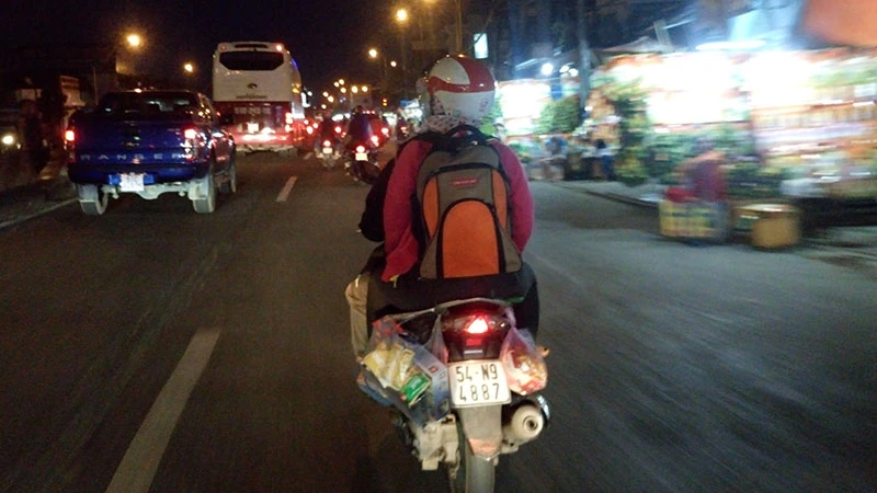 Tại quốc lộ 1 đoạn qua huyện Bình Chánh, hàng ngàn người dân di chuyển bằng xe máy chở lỉnh khỉnh đồ đạc trở lại TP.HCM sau Tết.