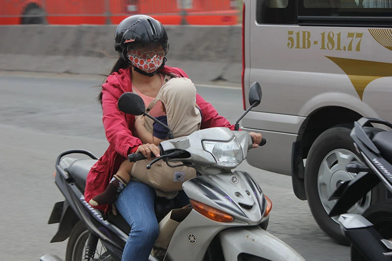 Một em nhỏ ngủ trên xe khi di chuyển trên đường.