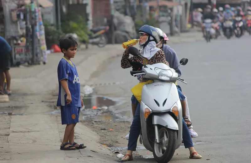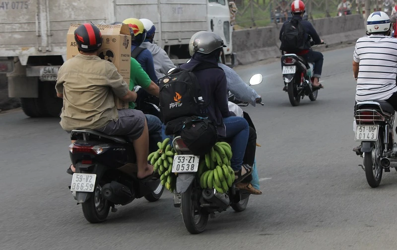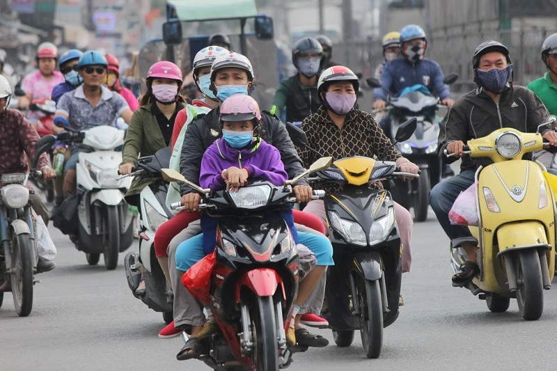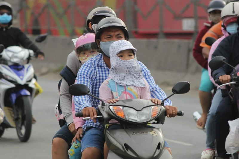 Cả gia đình đèo nhau bằng xe máy di chuyển qua đoạn đường huyện Bình Chánh về TP.HCM.