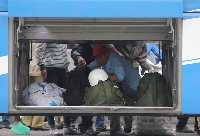 Nhân viên nhà xe soạn đồ đạc cho hành khách xuống Bến xe Miền Tây.