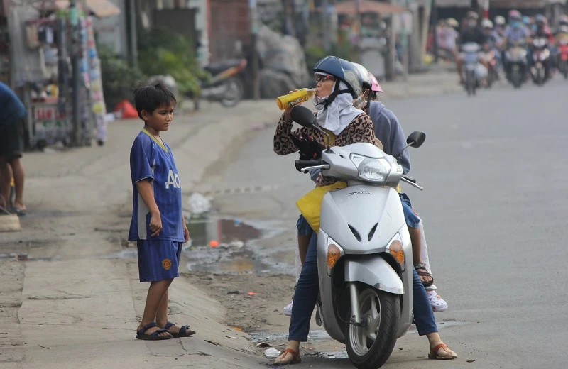 Người dân mua nước bên đường "tiếp sức" cho chặng đường về TP.HCM.