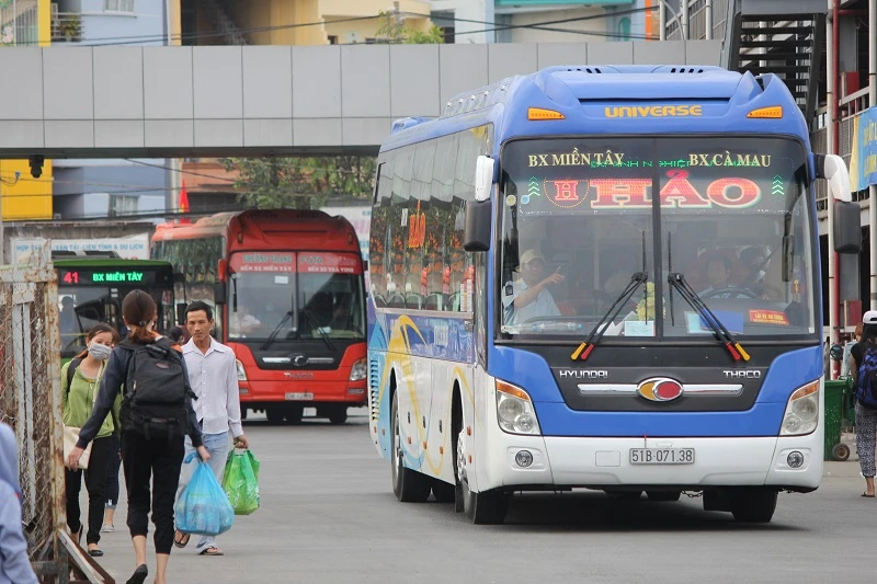 Tại Bến xe Miền Tây, xe khách từ các tỉnh miền Tây lên tấp nập vào bến.