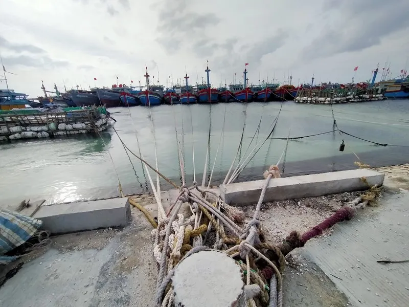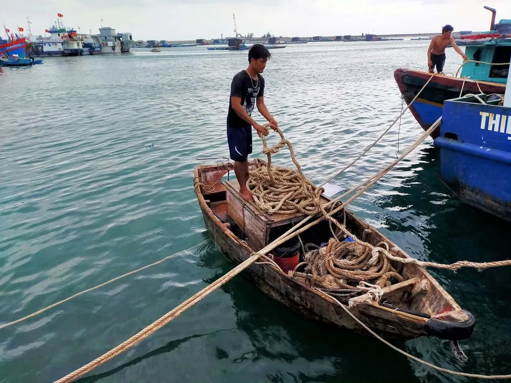 Ngư dân dùng dây thừng ràng buộc chắn chắn các thuyền tại bến neo đậu ở huyện đảo Lý Sơn. Ảnh: CHÍ TÂM
