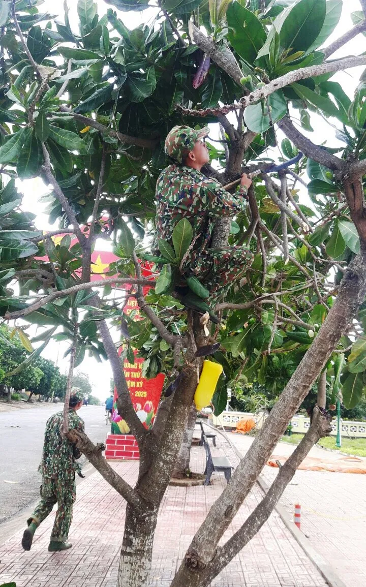 Bộ đội tập trung tỉa cây chống bão ở huyện đảo Lý Sơn. Ảnh: CHÍ TÂM