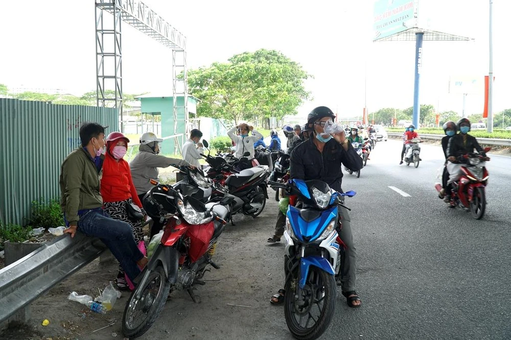 Dưới chân cầu vượt (quận Bình Tân, TP.HCM), nhiều người dừng lại nghỉ ngơi, tránh nắng, tranh thủ uống nước rồi tiếp tục di chuyển