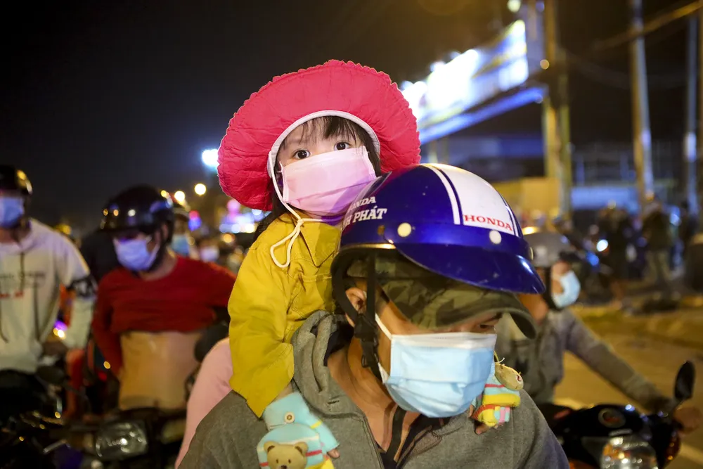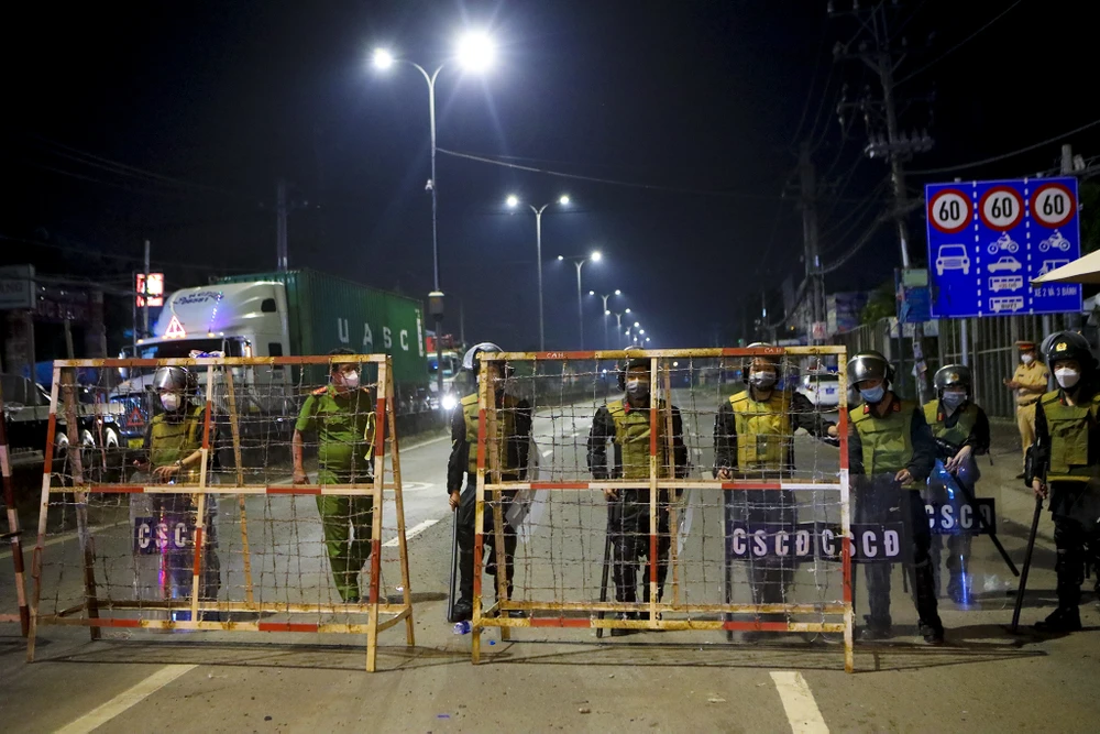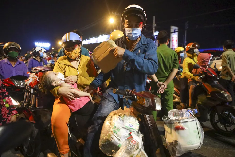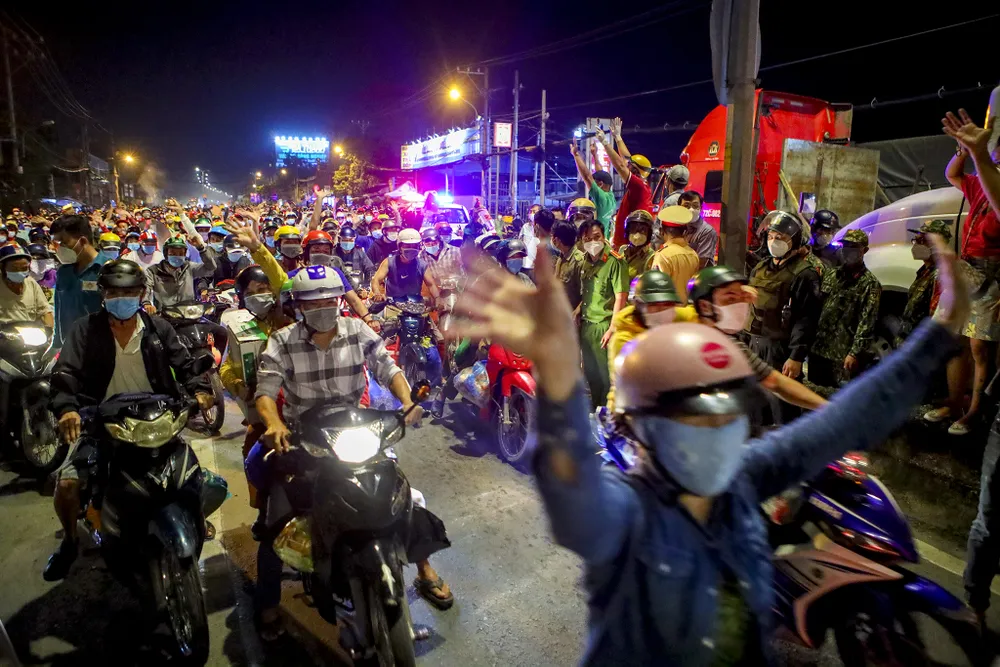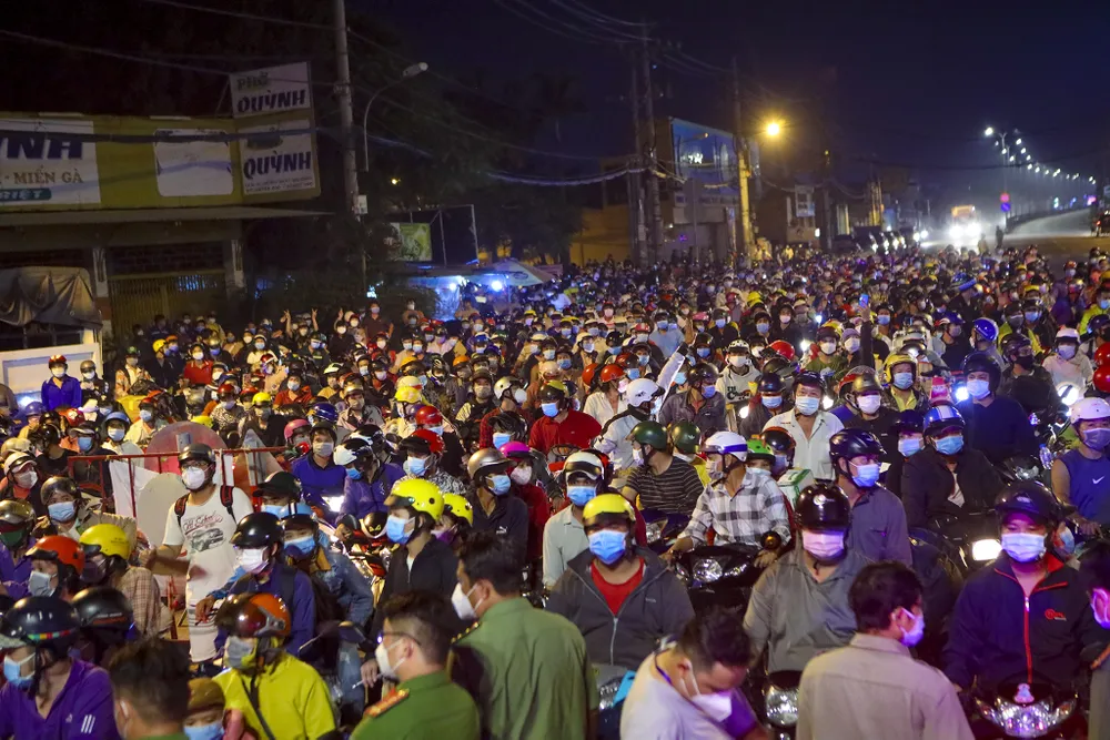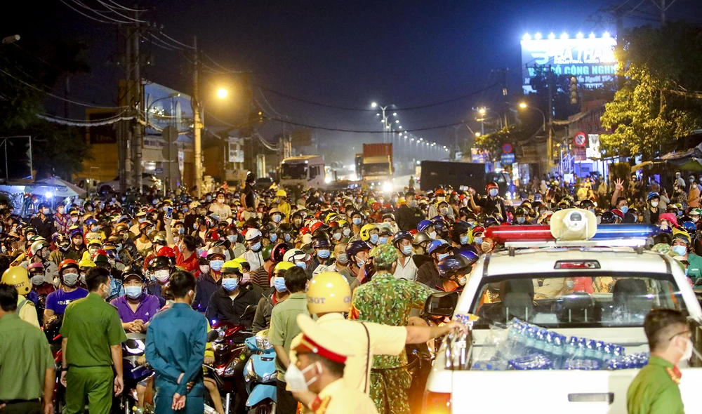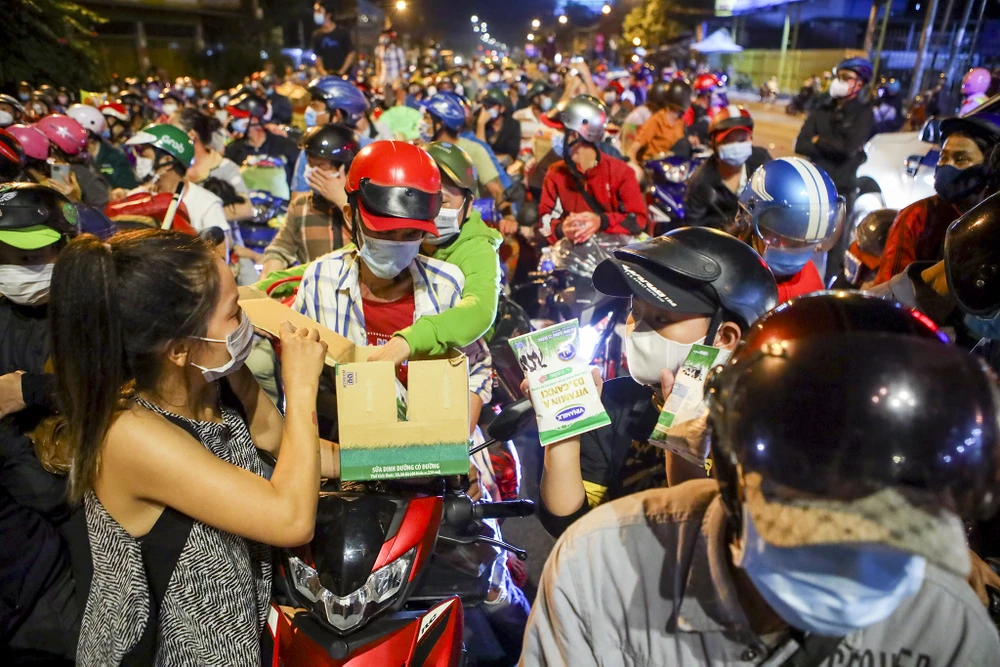 Từ 17h, tại chốt kiểm soát giáp ranh giữa huyện Bình Chánh (TP.HCM) và huyện Bến Lức (Long An) nằm trên quốc lộ 1, đoạn qua thị trấn Tân Túc để về miền Tây, khoảng 1000 người chạy xe máy chở lỉnh kỉnh đồ đạc đòi lực lượng chức năng thông chốt để về quê.