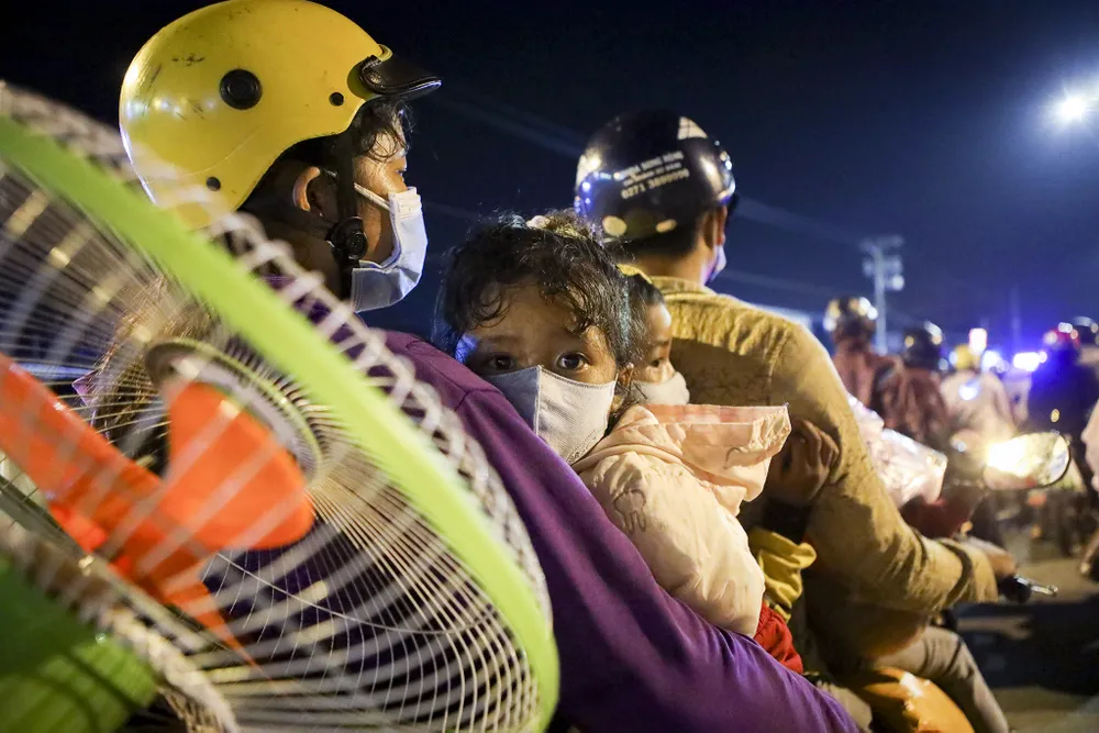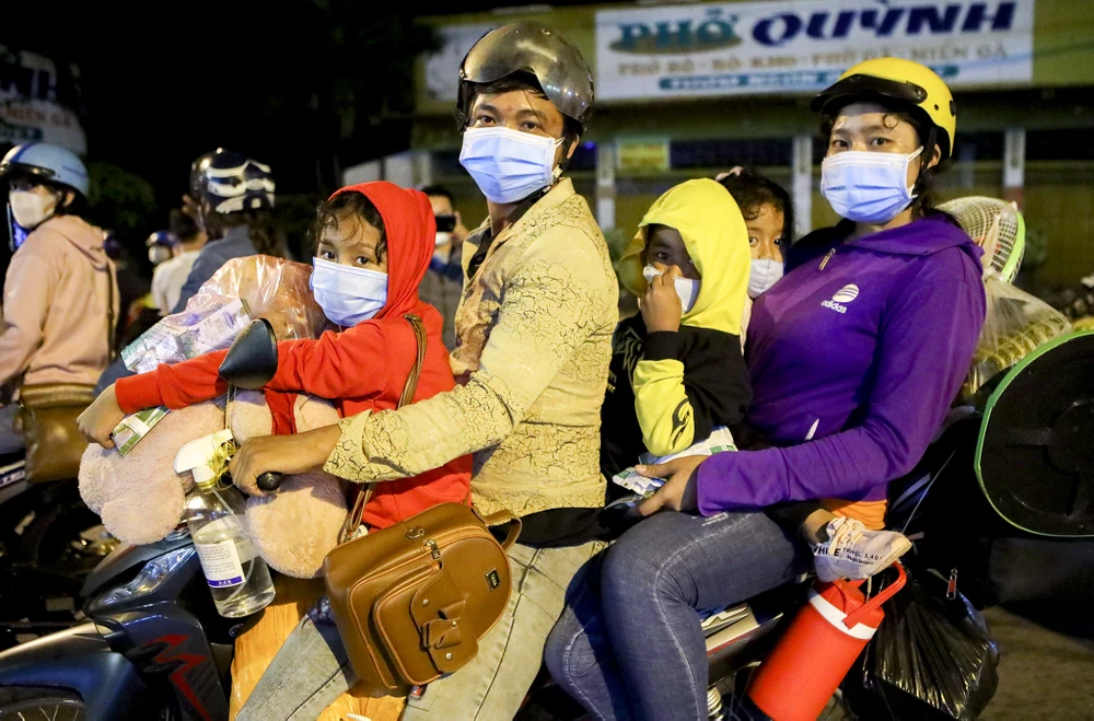 Những gia đình đèo nhau bằng xe máy với lỉnh kỉnh đồ đạc. Họ cho biết, gia đình đang gặp khó khăn về tiền trọ, chi phí sinh hoạt dẫn đến không thể tiếp tục trụ lại.